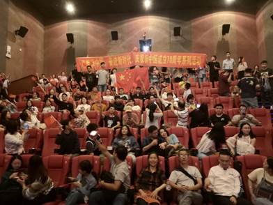 影片末尾,伴随着片尾曲,在班级同学的组织下,整个影院的观众们挥舞国旗,歌唱《我和我的祖国》。大家的歌声中饱含爱国热情,也对国家的今天感到无比自豪。