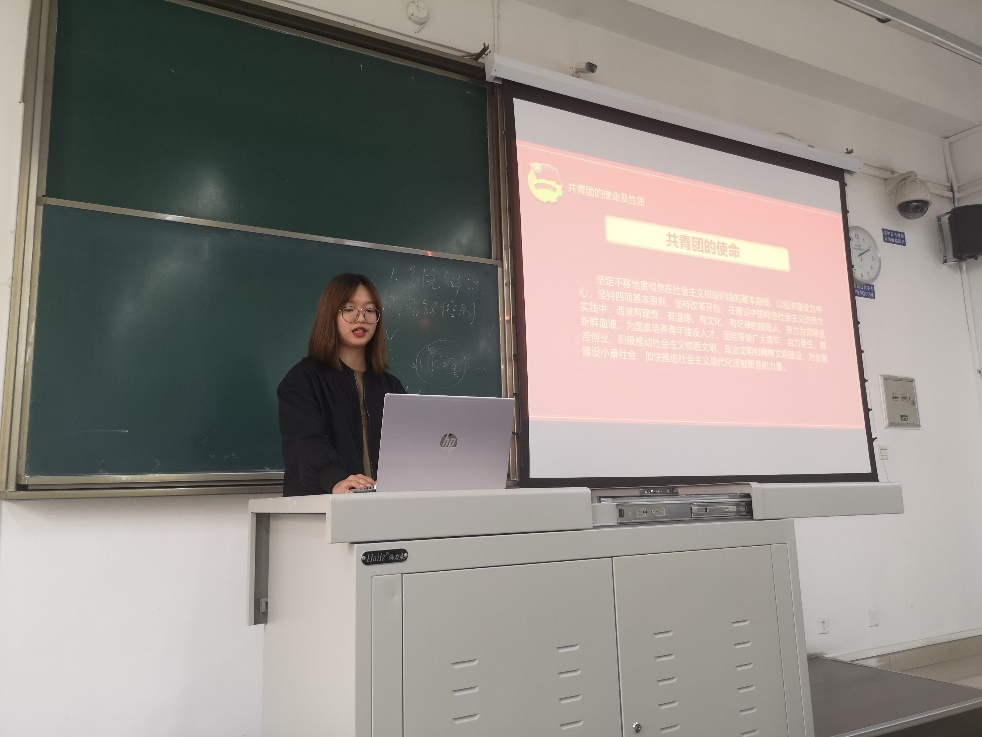 在活动中,孟雨同学首先以共青团的使命及性质为出发点,强调我们共青团员应当毫不动摇坚持党的领导,做党的忠诚助手和忠实后备军;牢牢抓住三个根本性问题,当好党联系青年的桥梁和纽带;坚定不移深化改革,不断增强共青团组织的吸引力和凝聚力。