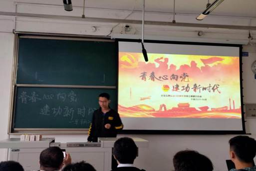 2019年10月28日,为弘扬爱国主义精神,增强学生对于党和国家的进一步深入了解,培养同学爱党奋斗精神,提高学生对于当今时代国家发展以及党团发展的认知,把握新时代党和国家的发展动向,车辆2019-01班、车辆2019-05班、车辆2019-06班、机械2019-08班以及机械2019-09班在2号教学楼开展了“青春心向党,建功新时代”主题团日活动。