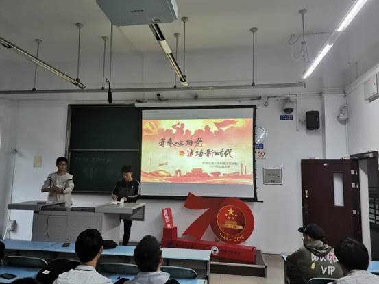 首先,由团支书为大家概括地讲解建国七十年来,中国的沧桑巨变。七十年,不仅极大改变了中国的面貌、中华民族的面貌、中国人民的面貌、中国共产党的面貌,汇聚成实现中华民族伟大复兴的盛大景象,而且我们能从这七十年中得到许多宝贵的历史启示,引导我们开启更为光辉的历程、创造更为伟大的奇迹。