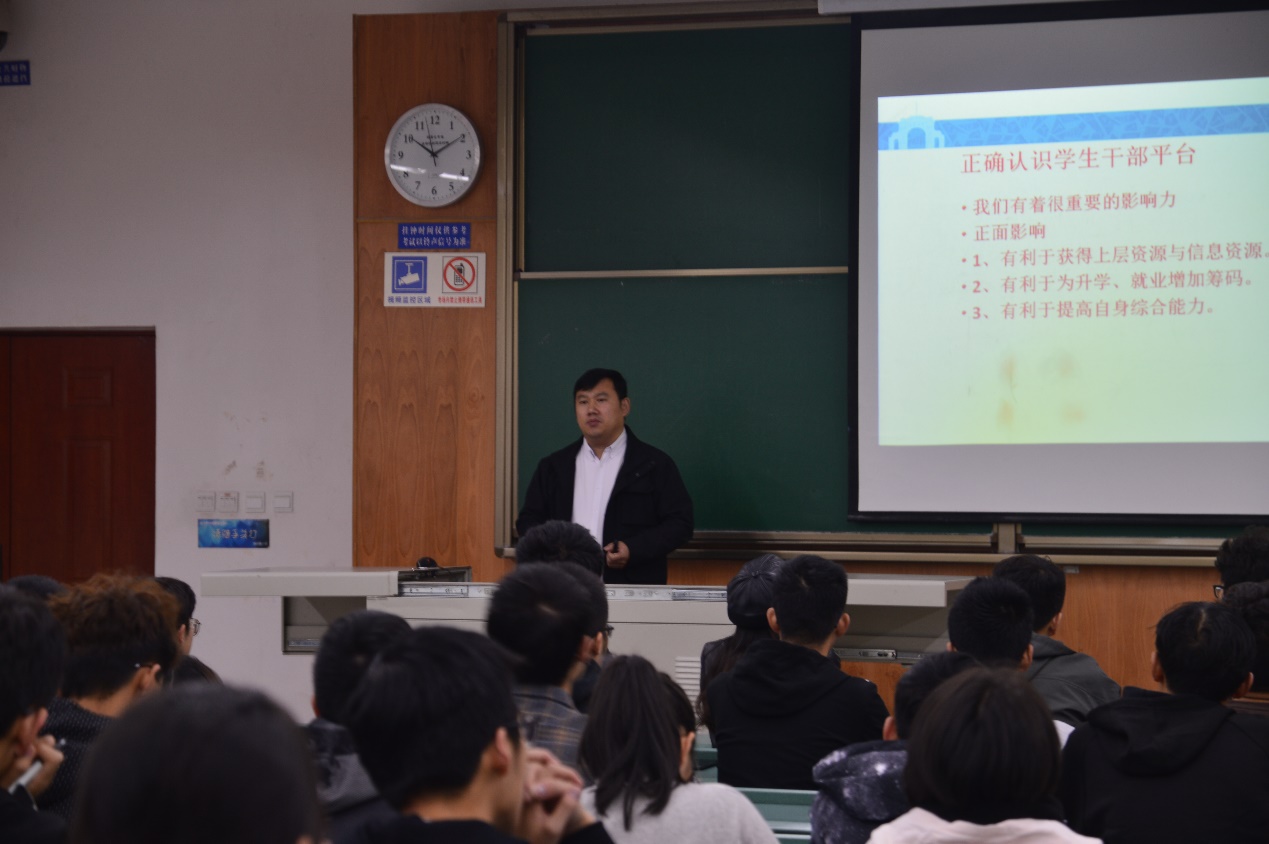 孟老师以“促进学生成长与发展的规划建设——提升自身的竞争力和领导力”为主题,为班团干部们介绍了要如何做一名优秀的学生干部。首先,孟老师号召同学们要先对学生干部平台有一个正确清晰的认识,明确自身的影响和责任所在。成为一名学生干部,就要求同学们要能时时刻刻以更高的要求来要求自己,为身边的同学做好示范。同时,孟书记还表示,希望同学们能注重提升以下几种素质:1、思想道德素质 2、能力素质 3、团队意识 4、心理素质 5、人文素质 。借此,孟书记提出了本次理论课的核心点,即“自我管理,自我服务,成长与发展并进。”孟书记希望同学们可以通过这种手段,实现个人的全面发展。