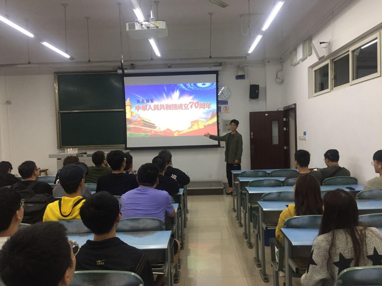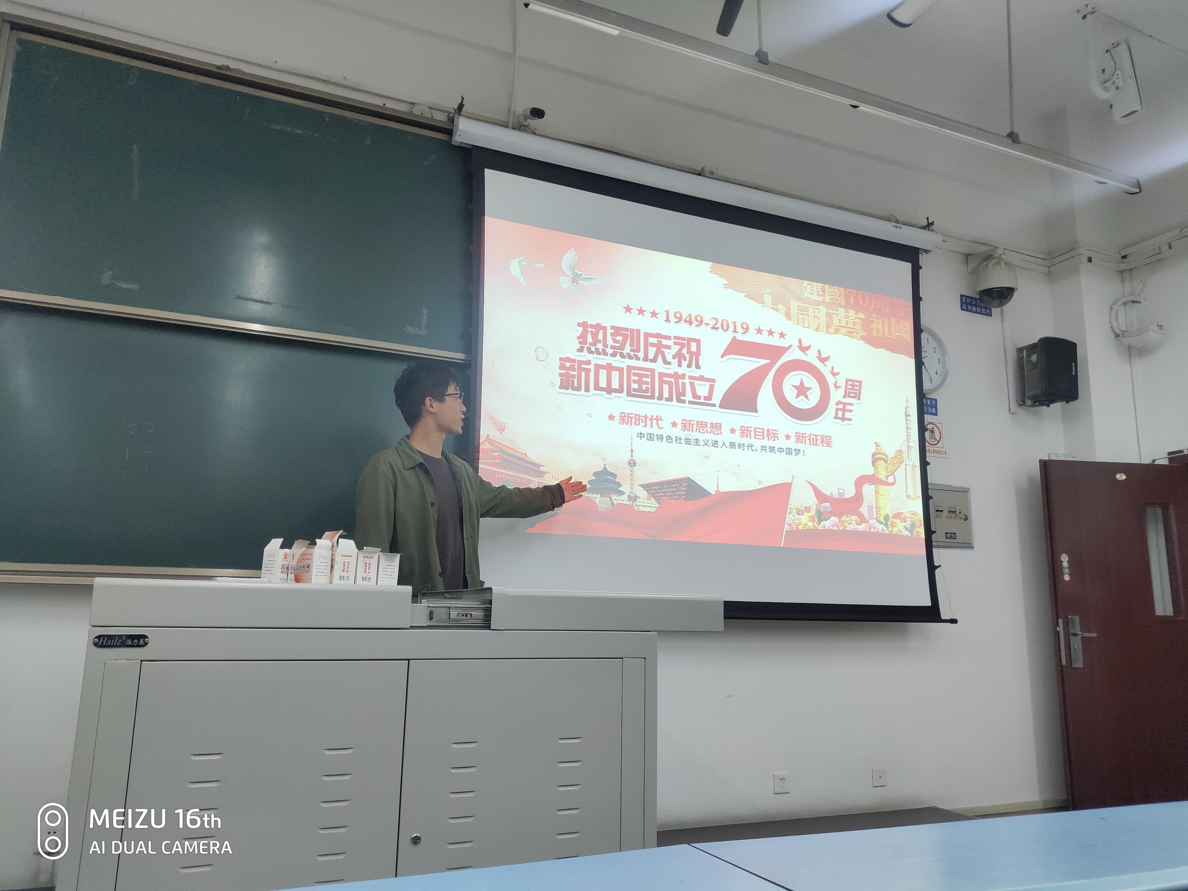团日活动第一项,庆祝新中国成立70周年。新中国从1949年建国以来,已经走过了70年的历程。团支书郑重带领大家回顾了新中国这70年来的发展和变化。新中国成立初期,从原始社会末期直接过渡到社会主义社会,摆脱民族压迫;2019年4月,宣告实现整族脱贫,告别世代贫困,人民生活水平的不断提高是对国家综合实力提升的重要表现。团支书郑重讲到,中国能在70年里能有这样飞速的发展,离不开中国共产党的领导,离不开马克思主义理论的支持。团支书讲完后,辅导员李曦老师对团支书所说内容进行总结,并和班里全体同学进行合影留念。