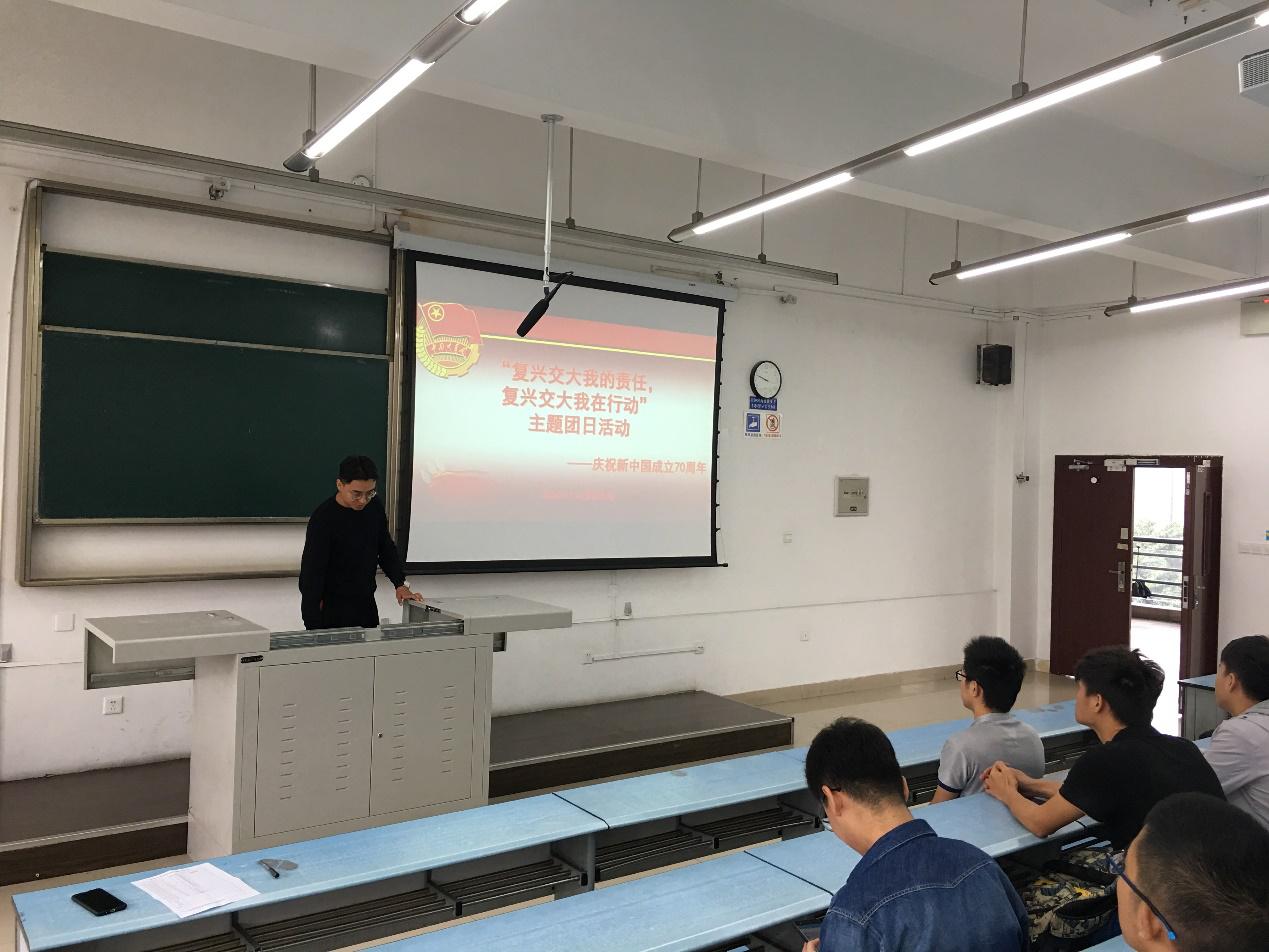 团支书海萨尔同学为我们介绍了本次活动的主要内容,再为我们细细讲解了新中国70周年来的伟大发展与变化。新中国从1949年成立以来,摆脱了帝国主义、封建主义和资本主义三座大山,五年目标一个接一个、从温饱到小康、再到如今的新时代中国特色社会主义理论体系,都说明了坚持党的领导是无比正确。海萨尔同学的介绍中不仅弘扬了爱国主义精神,更为我们的爱国主义教育添上了一笔,进一步激发了我们的爱国热情。