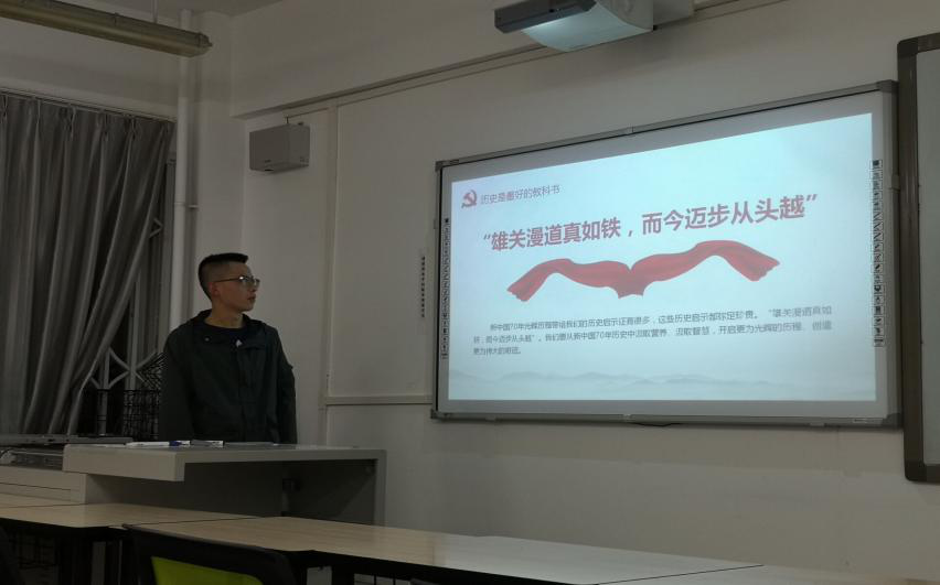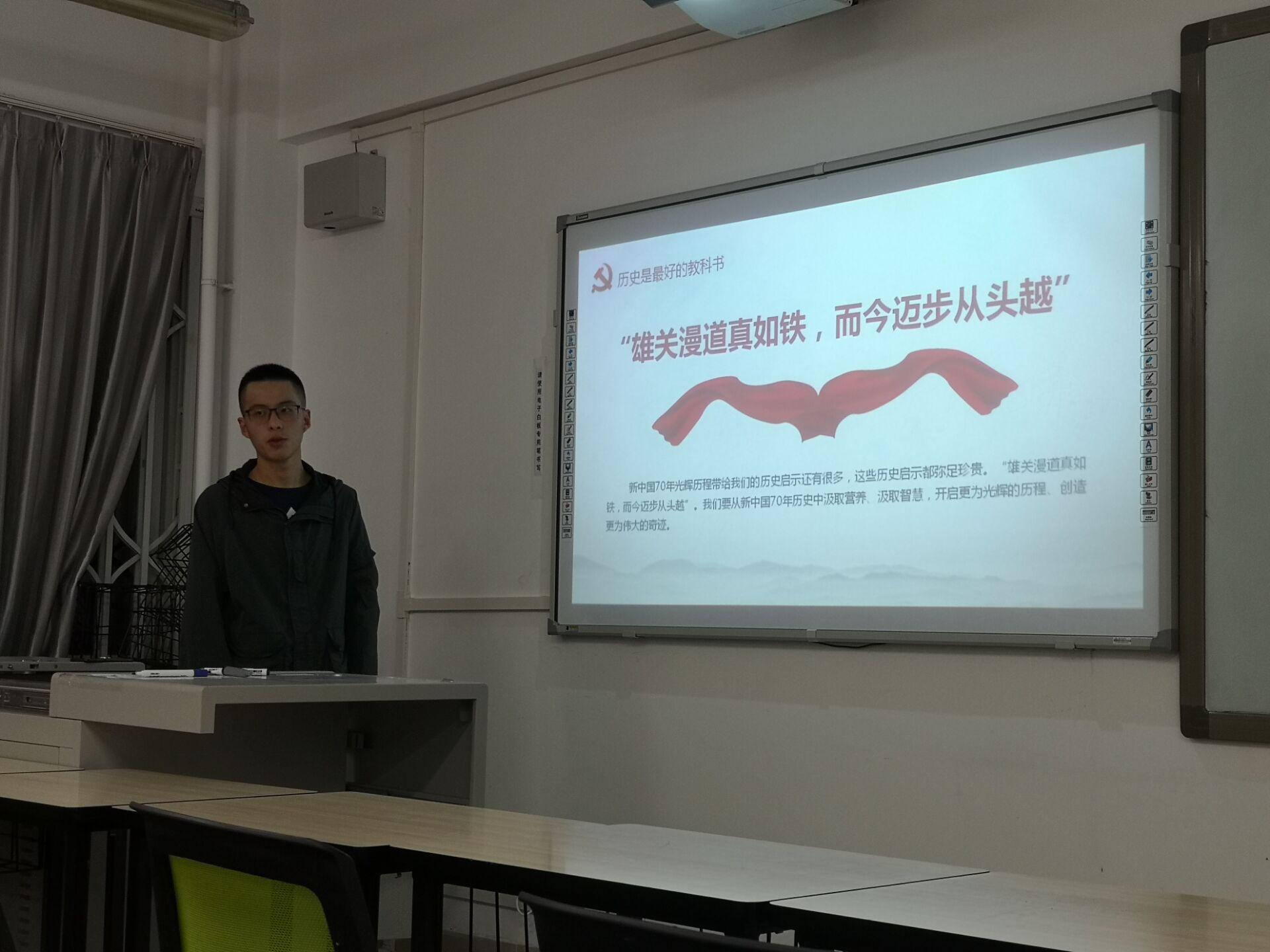 19:00会议正式开始,曲江鹏同学先简单的介绍了团日活动的内容及意义,并强调了会议纪律。曲江鹏同学说道:“从1949年成立以来,中国已经走过了70年艰辛而辉煌的风雨历程,中国人民见证了祖国是如何一步步走到今天的繁荣富强。作为当代大学生我们应牢记使命,向革命先辈学习,在和平年代用我们的知识为人民建设幸福的家园!”曲江鹏同学主要从国史发展脉络及学习意义、建国70年的历史进程回顾、建国70年伟大的奇迹、历史是最好的教科书这四个方面向同学们讲述建国70年来党和国家的一些重要方针和历史瞬间。