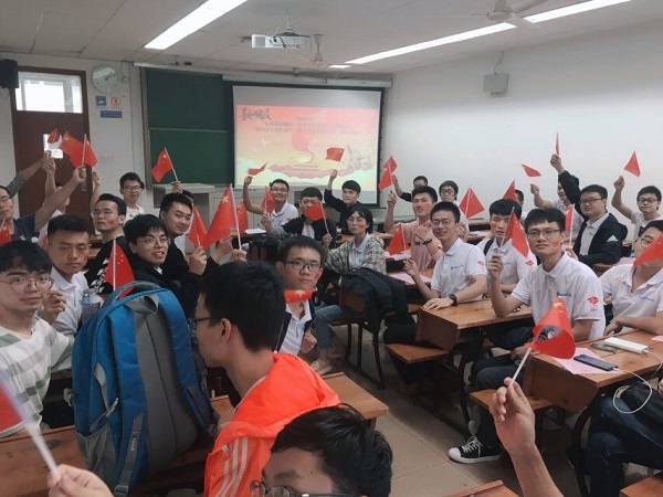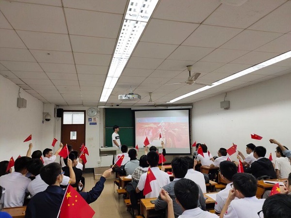 接下来,宣传委员梁豪从“新中国成立,十一国庆节历史由来”、“七十年光辉历程·伟大成就”、“中国进入社会主义新时代”、“十大中国爱国主义英雄事迹”和“追梦新时代·奋斗新征程”五个板块向同学们介绍建国七十年的历程。随后组织全班同学观看中国国家博物馆一场特别的快闪《今天是你的生日》,同学们也不由地跟着视频哼唱起来,来告白伟大的祖国。