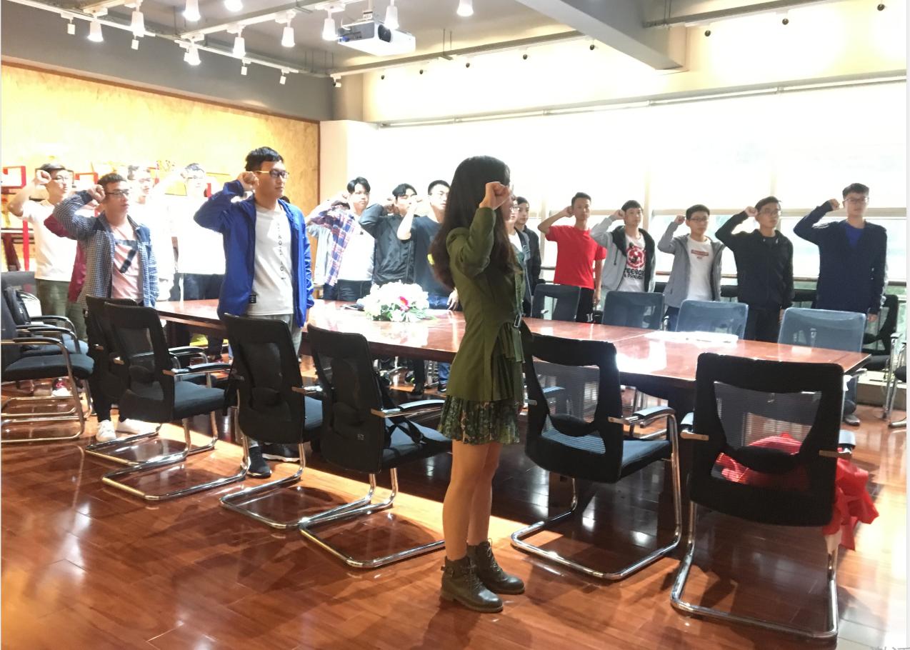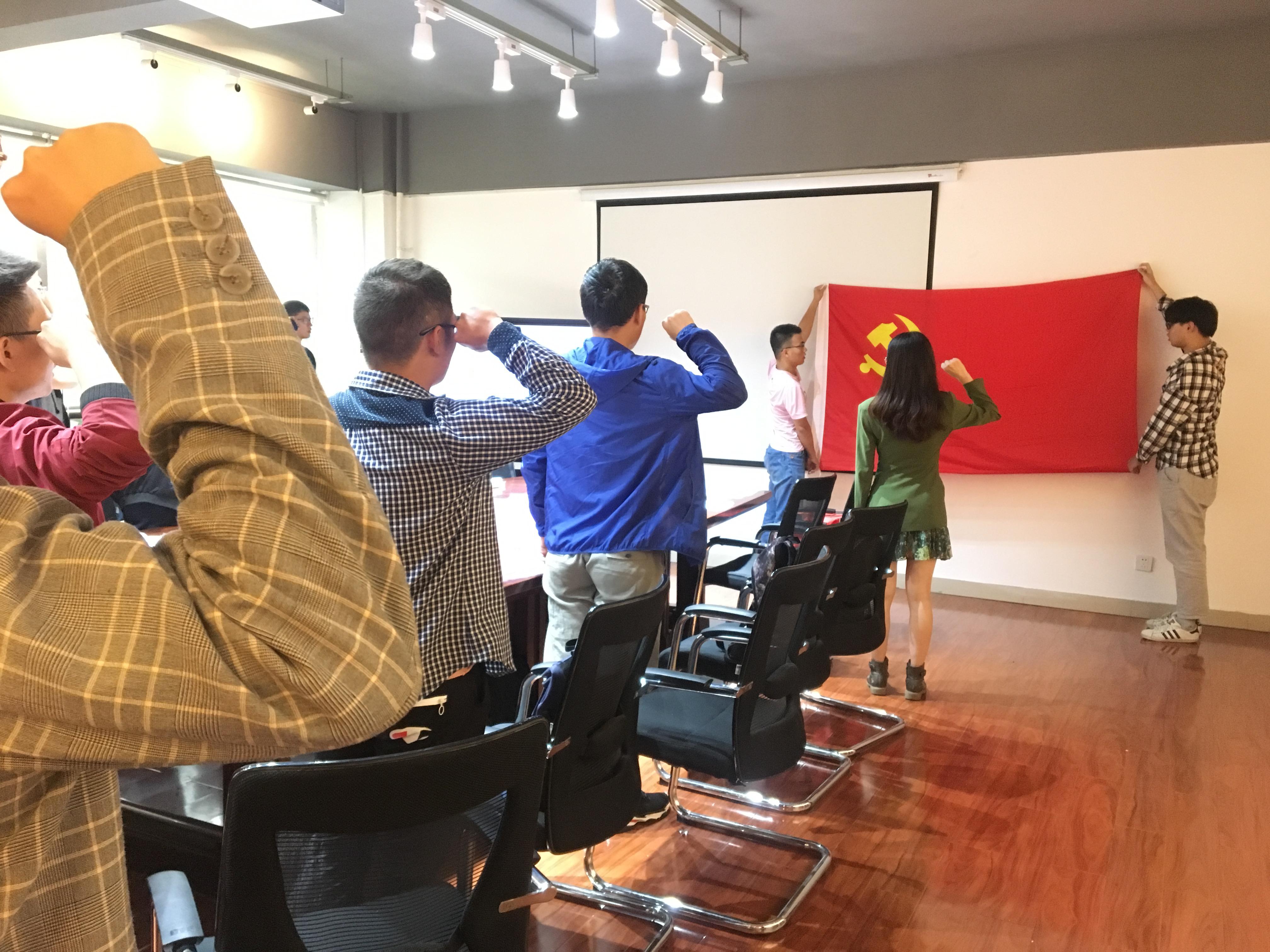 第一阶段,全体党员对党旗宣誓,重温入党誓词。党支部书记邓慧心老师带领全体党员同志,举起右拳,面向党旗宣誓:“我志愿加入中国共产党,拥护党的纲领,遵守党的章程,履行党员义务,执行党的决定,严守党的纪律,保守党的秘密,对党忠诚,积极工作,为共产主义奋斗终身,随时准备为党和人民牺牲一切,永不叛党。”这一场面庄严肃穆,各位党员同志们也发出了内心最真挚的呐喊。